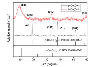 Fig. 2 presents XRD patterns of p-Co(OH)2 and h-Co(OH)2. For conventional p-Co(OH)2, four distinct peaks at 19.1°, 32.5°, 38° and 51.4° appeared and assigned to the crystalline plane (001), (100), (101) and (102) of β-Co(OH)2, respectively (JCPDS 00-030-0443) [23, 25, 26]. However, all the significant characteristic peaks belonged to α-Co(OH)2 in the h-Co(OH)2 spectra, as 9.5°, 17.8°, 33.7° and 59.5° peaks were assigned to the (003), (006), (012) and (113) crystalline plane of α-Co(OH)2 (JCPDS 00-046-0605), respectively [23, 27]. It is indicated that different crystalline phase formed for h-Co(OH)2 compared with conventional p-Co(OH)2 due to the solvothermal-hydrothermal method. In addition, the different Co(OH)2 phases can contribute to the distinct crystalline plane (reactive sites) to active PMS and result in the different removal efficiency of IBP.