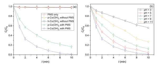 Fig. 3 shows the removal of IBP by PMS activated by h-Co(OH)2 or p-Co(OH)2. Control tests indicated that almost no removal (< 0.3%) of IBP by PMS direct degradation. Moreover, the adsorption of IBP by both h-Co(OH)2 and p-Co(OH)2 was negligible (< 0.2%), it is because the inorganic structure of Co(OH)2 is not sufficient to absorb organic compounds, which is consistent with previous reports [30, 31]. However, rapid and high degradation (83.6% and 98.6%) of IBP was observed within 10 min for both p-Co(OH)2 and h-Co(OH)2 with PMS, respectively, indicating the observed IBP degradation can be solely contributed to the efficient PMS activation by h-Co(OH)2 or p-Co(OH)2. The pseudo-first order kinetic model is used to interpret the kinetic data (Eq. (1)) [32-34]: