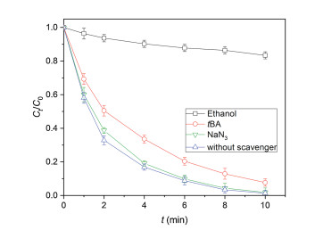 For pH effect, the solution pH was adjusted from 3 to 11. To quantify the contributions of different reactive oxygen species (ROS) to IBP degradation, scavengers including tert-butanol (tBA) or ethanol (2 mmol/L) was added before reaction to quench hydroxyl radical (·OH) and all radicals, respectively.