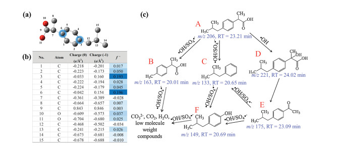 To evaluate the regioselectivity of generated radicals in the heterogeneous catalytic process for IBP molecules attacking, Fukui function (f-) based on the density functional theory (DFT) calculation was applied. Details on DFT calculation are presented in the Text S4 (Supporting information).
