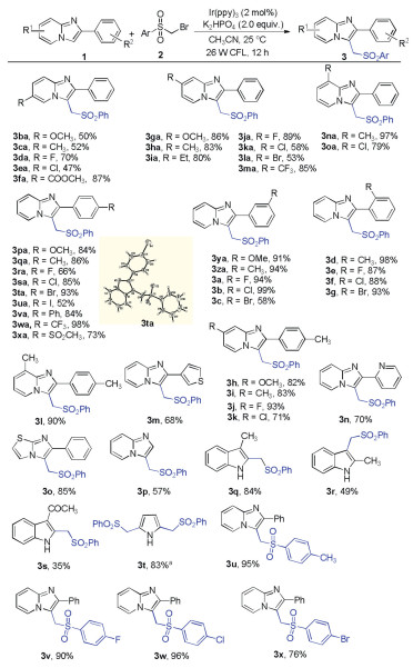 With the optimized conditions in hand (Table 1, entry 11), the generality and scope of the substrates were explored (Scheme 1). Initially, substrates with substituents on the C6, C7, and C8 positions of 2-phenylimidazo[1, 2-a]pyridines were examined. Various functional groups, including methoxy, methyl, ethyl, halogen and ester, were well tolerated under optimized reaction conditions (3ba-3oa). Moderate to excellent yields were obtained for most cases. While weak electron-withdrawing group (Cl) at C6 position led to a low yield (3ea). Furthermore, the effect of the substituent on the C2 phenyl ring was examined. Imidazo[1, 2-a]pyridines bearing electron-donating groups (OMe, Me, Ph) as well as electron-withdrawing groups (halogen, CF3, SO2CH3) on the 2-phenyl ring efficiently reacted with 2a to produce the C-3 sulfonylmethylated imidazo[1, 2-a]pyridine derivatives 3pa-3g in 52%–99% yields. The structure of 3ta was confirmed by single crystal X-ray crystallo-graphic analysis (CCDD No: 1903608). It is worth mentioning that steric hindrance could not be observed for congested o-substituted imidazo[1, 2-a]pyridines (3d-3g). In addition, di-substituted imi-dazo[1, 2-a]pyridines, with substitutions on both the pyridine and C2-phenyl ring also provided the corresponding products 3h-3l in high yields (71%–93%). 2-Thienyl and 2-pyridyl-substituted imidazo [1, 2-a]pyridine gave the products 3 m and 3n in 68% and 70% yields. Imidazo[2, 1-b]thiazole was also subjected to this reaction and produced the desired product 3o in good yield. Particularly, unsubstituted imidazo[1, 2-a]pyridine could be sulfonylmethylated, giving the target product 3p in 57% yield. Other heterocycles generally gave moderate to good yields of product in the case of indoles and pyrroles (3q-3t). Notably, this reaction tolerates free N H bonds and this method allows for the easy separation of product from starting material. To further examine the scope of the sulfonylmethylation reaction, the bromomethyl aryl sulfones were tested. Substituents, such as CH3, F, Cl, Br, were well tolerated and gave good to excellent yields (3u-3x).