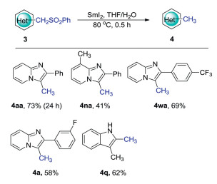 Desulfonylation of 3aa, 3na, 3wa, 3a, 3q was easily achieved under reducing conditions (SmI2 in THF/H2O) to unveil the methyl group and afforded the target products 4aa, 4na, 4wa, 4a, 4q, respectively (Scheme 2).