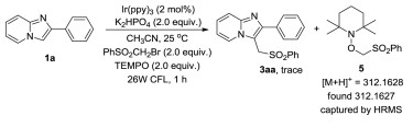 To understand the mechanism of this transformation, we attempted to perform the reaction under standard conditions with the addition of 2.0 equiv. of TEMPO (2, 2, 6, 6-tetramethylpiper-idinooxyl) as a radical scavenger (Scheme 3). Trace amount of product was obtained. However, the coupling product 5 of TEMPO with PhSO2CH2Br was captured by HRMS. These results indicated that the radical process might be involved in this sulfonylmethy-lation reaction.