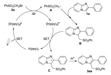 Based on these observations and literatures [11, 12], a possible catalytic cycle is proposed, as shown in Scheme 4. Firstly, the excited state [Ir(ppy)3*] was formed under light irradiation, which was next oxidized by PhSO2CH2Br 2a to generate a [Ir(ppy)3]+ complex and a ·CH2SO2Ph radical A. Subsequently, the radical A reacted with imidazo[1, 2-a]pyridine 1a to produce the intermediate B. Then, intermediate B was oxidized by [Ir(ppy)3]+ to form the intermediate C along with the regeneration of Ir(ppy)3. Finally, the deprotonation of C assisted by base afforded the desired product 3aa.
