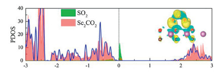 Figure 2 PDOS of SO2 molecule (green shadow), Sc2CO2 monolayers with (red shadow) and without (blue solid line) SO2 adsorption, respectively. The side views of charge density difference are given in the upright panels. Reproduced with permission [79]. Copyright 2017, The Journal of Physical Chemistry C.