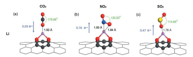 Figure 4 The bond angles (green) of acidic gases (a is CO2; b is NO2; c is SO2), the distances (black) from gases to metals and the electron transfers (blue) between gases and metal decorated GO (a–c is Li decorations). Reproduced with permission [100]. Copyright 2014, Physical Chemistry Chemical Physics.