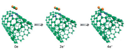 Figure 5 Adsorption configurations of CO2 on pyridine-CNT with 0, 2, and 4 electrons injection. Reproduced with permission [116]. Copyright 2014, ChemSusChem.