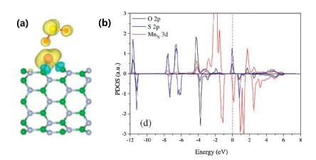 Figure 6 SO2 adsorbed on MnN-BNNT site. (a) Difference spin charge density of side view. (b) PDOS. Reproduced with permission [117]. Copyright 2015, Applied Surface Science.