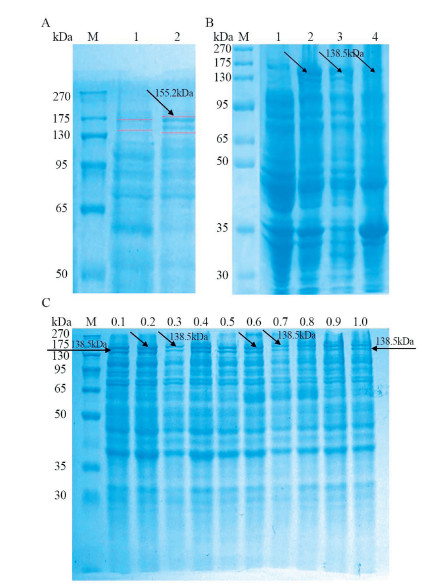 Figure 1 SDS-PAGE of recombinant LwCas13a. (A) M: protein marker, 1: uninduced E. coli, 2: E. coli induced by IPTG. (B) M: protein marker, 1: E. coli not induced by IPTG, 2: E. coli induced by IPTG, 3: supernatants after disruption, 4: insoluble impurities. (C) IPTG follow-through for induction of Cas13a.