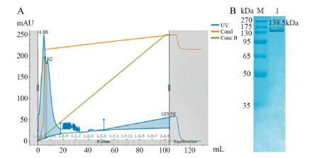 Mammalian codon optimized LwCas13a gene (encoding 11152 residues) was synthesized (Genescript) and subsequently cloned into bacterial expression system, pC013 Twinstrep-SUMOhuLwCas13a (Addgene plasmid #90097) to obtain the recombinant protein Cas13a. Using these plasmids about 50 ng, BL21 E. coli competent cells were transformed (Cwbiotech). After transformation 100 μL cells were plated on ampicillin and chloramphenicol LB-agar plate for 12–15 h at 37 ℃. Afterwards colonies were counted. Single colony was cultured in 10 mL starter LB medium with ampicillin to a final concentration of 100 μmol/L overnight. That was further used to inoculate 500 mL of LB medium with 100 μmol/L of ampicillin for growth at 37 ℃ and 220 RPM until 0.6 optical density (OD). Once the concentration met the requirements, isopropyl β-D-1-thiogalactopyranoside (IPTG) with a final concentration of 500 μmol/L was added to induce protein expressionwhile adjusting incubator temperature to 16 ℃. After 16 h of cultivation, cells were then centrifuged at 4500×g for 10 min at 4 ℃. Cell pellet was harvested and re-suspended in lysis buffer (20 mmol/L Tris-HCl, 500 mmol/L NaCl, 1 mmol/L DTT, pH 7.4), supplemented with protease inhibitors (MCE) and lysozyme, followed by sonication (JX-650, Shanghai, China) by adjusting conditions as: 200 W of power, ultrasonic 2.5 s and 10 s of pause for 25 min. The soluble substances were separated from insoluble impurities by centrifugation for 90 min at 4 ℃ at 10, 000×g, and the supernatant was filtered through a 220 nm filter (Sterile Millex). SUMO protease was then loaded onto the column and incubated overnight at 4 ℃. The recombinant proteins were further purified by 5 mL HisTrap HP nickel ion affinity column by removing the 6 His-SUMO tag using AKTA purifier (AKTA PURE, GE Healthcare Life Sciences) and then the column was washed by wash buffer (20 mmol/L Tris-HCl, 500 mmol/L NaCl, 30 mmol/L imidazole, pH 7.4). The purity of the recombinant proteins was evaluated by SDS-PAGE. Fractions containing pure LwCas13a were pooled and buffer exchanged via a Millipore centrifugal ultrafiltration tube (Amicon Ultra) to storage buffer (600 mmol/L NaCl, 50 mmol/L Tris-HCl, pH 7.5, 5% glycerol, 2 mmol/L DTT) and kept at -80 ℃.