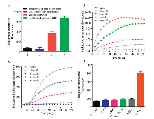 Figure 3. (A) Activity detection of LwCas13a. Bar 1: Target RNA replaced by non-target; Bar 2: Cas13a replaced by another protein; Bar 3: Experimental group; Bar 4: RNase A with quenched florescence probe. (B) Concentration gradient detection of CPV-2 DNA. (C) CPV-2 minimum detection and time limit through CRISPR-Cas13a detection system. (D) Detection of various dog viruses with optimized Cas13a detection system (n = 3 technical replicates, Bars represents mean ± S.E.M).As CPV-2 is an ssDNA virus so we cannot detect CPV-2 directly through CRISPR-Cas13a detection system therefore, we have converted DNA to RNA. We employed RPA and T7 transcription for the amplification of our nucleic acid target. RPA and T7 transcription system also improved the sensitivity of the detection system. Our detection system consisted of 0.48 μL RPA forward primer, 0.48 μL RPA reverse primer, 10 μL 2X Reaction Buffer, 1.8 mmol/L dNTP, 1 μL RNase inhibitor, 2 μL 10X Basic E-mix, 1 μL 20X Core Reaction mix, 0.4 μL 50X RT, 14 mmol/L MgOAc, 5 μmol/L RNA probe, 2.5 μL. Different concentration of the target DNA and finally buffer was used to make the final volume up to 20 μL. These samples were then placed in a 384 well plate and were taken to SpectraMax5 for reading (excitation wavelength was 492 nm and emission wavelength was 518 nm). The system was allowed to run for 1 h and 30 min and readings were obtained after every 5 min (Fig. 3B). We diluted some of the CPV DNA into 10 fmol/L sample and after we made a 10-fold serial dilution of this sample, followed by the addition of Cas13a protein. The readings obtained after detecting the sample through spectraMax5 are shown in Fig. 3C. The optimized identification system was able to detect 100 amol/L of CPV-2 DNA within 30 min.