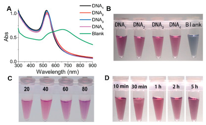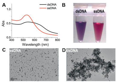 The most important characteristics of AuNPs are localized surface plasmon resonance (LSPR). The LSPR of AuNPs is related to their shape, size, and inter-particle distance [1, 2]. AuNPs exhibit strong and well-defined colors and its color could change from red to blue through aggregation. Based on its strong distance dependent optical, AuNPs could be used as visual signals for detecting DNA, RNA, and cells. Currently, there are two classes of AuNPs based visual assays. One is sandwich hybridization assay, which was developed by Mirkin [3]. In this assay, two kinds of AuNPs modified with two kinds of thiolated oligonucleotide probes were prepared. The sandwich hybridization occurred in the presence of target DNA, leading to the AuNPs aggregation and a color change from red to blue. The other one is based on the different binding properties towards unmodified AuNPs between ssDNA and dsDNA. The ssDNA can uncoil to expose its bases, bind to negatively charged AuNPs through electrostatic force [4], and prevent the AuNPs against salt-inducted aggregation [5]. Whereas, dsDNA could coil to form stable double-helix geometry and presents the negatively charged phosphate backbone, which caused dsDNA, could not bind to AuNPs, thus the AuNPs aggregated. The advantage of the second assay is avoiding functionalization of AuNPs [6]. Plenty of methods, which based on unmodified AuNPs aggregation, have been reported for visual detection of small molecular [7], DNA [8-12], bacteria [13], nuclease activity [14], and metal ions [15].
