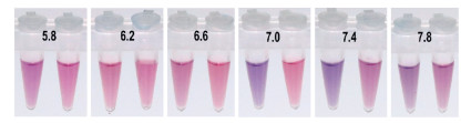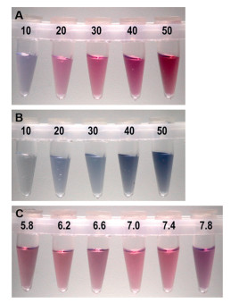 While a weak alkalinity environment could promote DNA hybridization. An important parameter of this method is pH value that can strongly influences the hybridization of dsDNA. As shown in Fig. 2C, the synthesis of ssDNA stabilized AuNPs was insensitive to pH value in the range of 5.8-7.8. Fig. 4 illustrates the effect of pH value to visual detection of dsDNA. Under weak acids environment, the solution containing either complementary DNA or random DNA keeps red, suggesting non-aggregation of AuNPs. When the pH value was adjusted to neutral or weak alkalinity, the solution containing complementary DNA change to purple while the solution containing unmatched DNA still kept red. It should be noticed that the color discrimination of solution reduced with the increase in pH value, which makes recognition of target DNA hard by naked eye. Considering sensibility of naked eye, the DNA detection assay was conducted under pH 7.0.