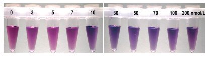 Fig. 5 demonstrates the relationship between the concentration of complementary DNA and solution colors. With the increase of target DNA concentration, the solution color gradually turned to purple. The results showed that the color changed to purple as the complementary DNA concentration was 10 nmol/L, preliminarily suggests the limit detection of complementary DNA concentration is 10 nmol/L via naked eye without any instruments. Besides, the probe length could also affect hybridization efficiency. Compared with probe of 13 bases, the probe of 21 bases was better for visual detection (Fig. S2 in Supporting information). Therefore, we use the probe of 21 bases to detect the clinic samples. Different probe length sequences were showed in Table S1 (Supporting information).