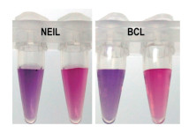 Following the model experiments, we performed visual analysis based on PCR amplification. Firstly, gastric cancer genes were amplified in a 30 μL reaction system. Secondly, dsDNA was captured by magnetic particles and transformed to ssDNA through thermal denaturation and magnetic separation. Thirdly, target DNA was detected following the protocol illustrated in clinic sample detection assay. Two pairs of primers were designed for the amplification of gastric cancer genes, and two short oligonucleotide probes were designed for hybridizing with the PCR-amplified DNA. The purified single strand PCR product was hybridized with oligonucleotide probe at 37 ℃ for 30 min. After hybridization, HAuCl4 and ascorbic acid were added into the mixture solution immediately. As shown in Fig. 6, the solution changed to purple in 10 min in thepresentof targetDNA.While, the colorof solution could retain red over 5 h for negative sample. The two designed PCRamplified DNAs could be identified through the change of color.
