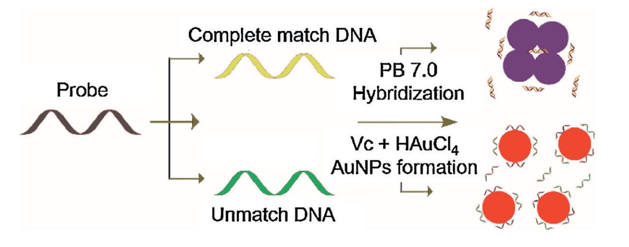 In this article, we established a rapid platform for DNA detection during the formation of AuNPs based on different electrostatic properties of ssDNA and dsDNA. The different properties in AuNPs aggregation can be used to determine whether a sample contains special sequence DNA. As shown in Scheme 1, the ssDNA could bind to the in situ synthesized AuNPs due to its exposed bases thus make AuNPs stable and present a stable red color. However, in the present of target DNA, the binding between formed dsDNA and AuNPs was disturbed, owing to their electrostatic repulsion, thus, the synthesized AuNPs aggregated, the solution would change to red immediately and turn to purple in 10 min. An important factor of this assay was to find an appropriate reductant. As ascorbic acid has a mild reaction rate, which can reduce Au3+ to AuNPs at room temperature, therefore, was chosen as reductant in this assay. Moreover, this strategy was simple for use without time-consuming chemical modification process.