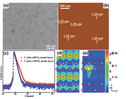 Figure 11 (a) TEM image, (b) AFM image of Vv-rich o-BiVO4 atomic layers with oneunit-cell thickness. Defects characterization for the V v-rich and Vv-poor o-BiVO4 atomic layers: (c) positron lifetime spectrum, (d, e) schematic representation of trapped positrons. Reproduced with permission [82]. Copyright 2017, American Chemical Society.