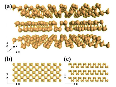 Figure 15 Schematic atomic structure of BP. (a) 3D structure. (b) Top- and (c) sideview of the 3D structure in (a). The armchair- and zigzag- configurations are along the x- and y-axial directions, respectively. Golden balls refer to P atoms. Reproduced with permission [1]. Copyright 2017, Royal Society of Chemistry.