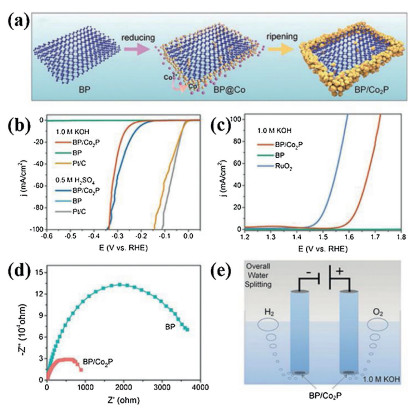 Figure 16 (a) Schematic illustration for the formation process of the BP/Co2P heterostructures. (b) The HER polarization plots of BP, BP/Co2P, and Pt/C measured in 0.5 mol/L H2SO4 and 1.0 mol/L KOH solution, respectively. (c) The OER polarization data of BP, BP/Co2P and RuO2 measured in 1.0 mol/L KOH solution. (d) Comparison of EIS curves between bare BP and BP/Co2P. (e) Schematic diagram of overall water splitting on BP/Co2P. Reproduced with permission [118]. Copyright 2018, Wiley-VCH Verlag GmbH & Co. KGaA, Weinheim.