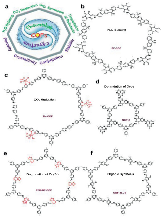 In 2005, Yaghi and co-workers reported a new class of crystalline porous polymers, covalent organic frameworks (COFs), which are constructed through reversible condensation reactions by topological design principles [9]. COFs allow the precise integration of organic building blocks into extended, porous, crystalline architectures through covalent bonds. They are unique and have ordered π-columns and discrete nanopores, these structural features are not available for traditional linear polymers and amorphous porous polymers. The permanent porosity can facilitate the rapid transport of photogenerated charges to the surface and increase the interaction surface between COFs and various guests such as sacrificial reagent, co-catalyst, reactant and/ or substrate. The high crystallinity is also beneficial to photoinduced charge transport, thus preventing recombination of photogenerated carriers. Covalent bond connection increases the stability of the skeleton to hydrolysis, oxidative and reductive conditions. Indeed, COFs have been proven to be excellent heterogeneous photocatalysts for light-induced H2 evolution, photocatalytic CO2 reduction, light-driven organic transformation, photocatalytic degradation of pollutants and so on (Fig. 2a) [10].