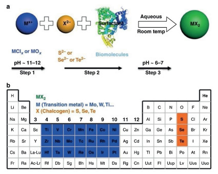 Figure 21 (a) The synthesis of commonly reported TMDs (MoS2, WS2, RuS2, MoTe2, MoSe2, WSe2 and RuSe2). (b) Extrapolating the synthesis method to other TMD synthesis may present a universal method to synthesis the various TMDs. Reproduced with permission [163]. Copyright 2019, Nature Communication.