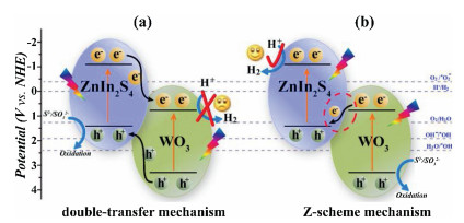Figure 3 Schematic diagram of mechanism for the photocatalytic H2 evolution under visible light irradiation over WO3/ZIS samples: (a) double-transfer mechanism and (b) Z-scheme mechanism. Reproduced with permission [26]. Copyright 2019, Royal Society of Chemistry.