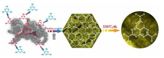 Figure 5. Fabrication process of highly porous g-C3N4 with 3D network via thermal polymerization of melamine-cyanuric acid supramolecular complex. Reproduced with permission [34]. Copyright 2018, Elsevier.Due to the low manufacturability and scarcity of metal-based cocatalysts, surface defect engineering is brought forth as one of the promising strategies to address this challenge through the rational design of a single-catalyst g-C3N4 system. Methods such as alkali-assisted approach, post-hydrogenation and photoassisted treatment are commonly employed to induce carbon or nitrogen vacancies in the g-C3N4 matrix. By regulating the degree of vacancy-induced, optoelectronic characteristics of g-C3N4 could be easily modulated to cater for a specific photocatalytic application. The introduction of vacancy sites can improve the light-harvesting ability of g-C3N4, and effectively tune the electronic band configuration by importing a new energy level in the bandgap known as defect state. This level has an associated defect wavefunction and could behave as an electron reservoir [36]. Using post-hydrogenation treatment, we obtained nitrogen defectmodified 2D g-C3N4 atomic layers for CO2 photoreduction process, which exhibit 5.14-fold enhancement in its performance as compared to bulk g-C3N4. One important characteristic of the defective g-C3N4 is the extended solar absorption to near-infrared (NIR) region (λ > 700 nm), which can be ascribed to the shorter electron transition pathway from ground-to-defect state [31]. While this strategy has been successfully demonstrated, there remains a large grey area concerning the role of defect state in promoting the photocatalytic performance of g-C3N4. Future exploration could focus on the fundamental study of defect state in photocatalyst by theoretical modeling.