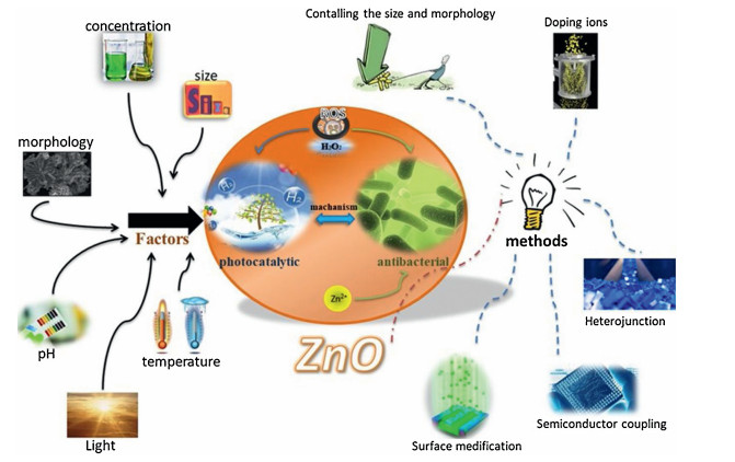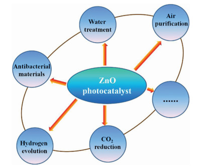 ZnO is one of inherently wide band-gap semiconductors, which is highly investigated in the fields of air purification, water treatment, antibacterial materials, and hydrogen evolution (Fig. 6). It has become the research hotspots in the past decades due to the advantages of low cost, non-poisonous, complete mineralization and sustainability. However, ultraviolet light must be used as the irradiation source of ZnO for its wide band gap. Therefore, the efficiency and applications of ZnO under the visible solar spectrum were greatly limited [50]. Moreover, the rapid recombination of electron and hole resulting in the low yield of ROS. Thus, immediate attention and efforts should be paid to tailor the visible activity of ZnO photocatalysts and constructing novel multifunctional ZnO-based nanocomposites.