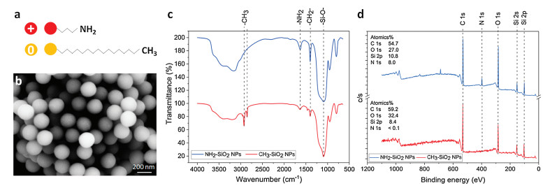 SiO2 nanoparticles with modification were dried on the foil for Scanning Electron Microscope (SEM, JSM-6700 F, JEOL) imaging. The images were recorded at an acceleration voltage of ~10 kV and a magnification of 3000-5000. Size distributions and zeta potential in PBS of SiO2 NPs, NH2-SiO2 NPs and CH3-SiO2 NPs were analyzed using Zetasizer Nano ZS, Malvern Panalytical. X-ray photoelectron spectrometry (XPS Thermo Scientific) was used to examine the surface element compositions of the two particle samples. Infrared spectroscopy (NICOLET iS50 FT-IR) was used to distinguish the functional groups on the SiO2 particle samples. For IR examination, aminated and alkylated nanoparticles were dehydrated under an infrared lamp, and then the dried particles were embedded with potassium bromide (KBr) and tableted to ~500 nm thick films for further infrared spectroscopy. Infrared spectra were acquired at 2 cm-1 resolution.