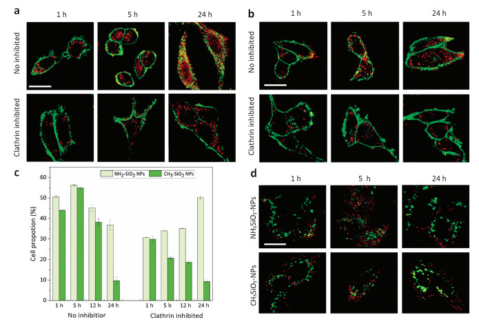 Figure 2. The cellular uptake of (a) aminated and (b) alkylated nanoparticles at different time points in the absence and presence of clathrin inhibitor (scale bar =10 μm). (c) Flow cytometry analysis of cellular uptake amounts of aminated and alkylated nanoparticles with and without clathrin inhibitor. (n = 5; 50, 000 cells per group). (d) The subcellular localization of aminated and alkylated nanoparticles (red) in comparison with lysosomes (green) after 1 h, 5 h, and 24 h co-incubation (scale bar =10 μm).Referring to flow cytometry analysis results (Fig. 2c and Fig. S2), side scattered light intensity (SSC-H) was selected as an indicator presenting the endocytosis quantity of the nanoparticles. As is shown in Fig. 2c and Fig. S2, the cell proportion with large amounts of nanoparticles internalized increased from 1 h to 5 h and reached amplitude at 5 h (56%) but decreased from 5 h to 24 h. The results revealed that the endocytosis of both aminated and alkylated is a time-depending process within 5 h. However, after 5 h, the proportion of cell endocytosing large amounts of nanoparticles decreased because the dilution effect of cell division as well as the cell death caused by too much nanoparticle endocytosis. Compared with aminated ones, alkylated nanoparticles were less internalized by cells. Moreover, the endocytosis of alkylated particles decreased more rapidly after 12 h. Since the dilution rate is relatively unchanged, we speculated that cells with large quantities of the alkylated particles turn to unhealthy and SSC-H results will be influenced by alkylated particles.