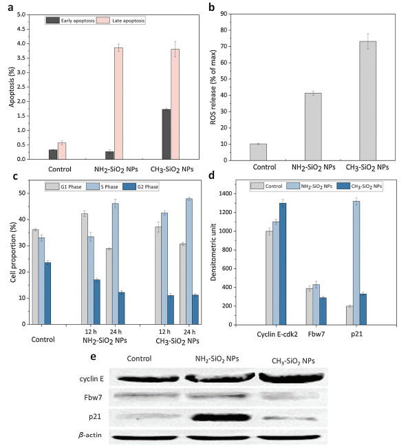 Figure 3 (a) Cell apoptosis analysis and (b) ROS release of cells exposed to aminated and alkylated nanoparticles for 24 h. The cells in control groups were cultured without any of the particles (*P < 0.05, ** P < 0.01; n = 5; 50, 000 cells per group for ROS, 100, 000 cells per group for cell apoptosis). (c) Cell cycle assay after 12 h and 24 h aminated and alkylated nanoparticle incubation (*P < 0.05, ** P < 0.01; n = 5; 100, 000 cells per group). (d) Quantitative data of p21, cyclin E and Fbw7 abundance after cells exposed to aminated and alkylated nanoparticles (n = 3). (e) p21, cyclin E and Fbw7 abundance after cells exposed to aminated and alkylated nanoparticles. Cells in control groups were cultured without any of the particles.