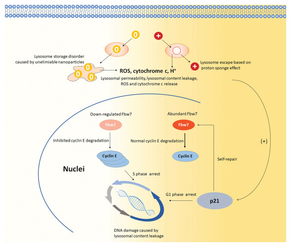 In conception, aminated and alkylated nanoparticles caused lysosome damages and DNA injures in different extents so that induced different post-self-repair responses in RGC5 cells (Fig. 4). For alkylated nanoparticles, because they are neutral charged and undegradable, when they entered lysosomes, they accumulated in lysosomes and caused lysosome storage disorders, which finally resulted in lysosome burst and collapse. The rapid and violent lysosome damages caused lysosome content release and ROS release, which induced DNA damages and early apoptosis. Though too quick and serious to be repaired, the so-caused DNA damages still went through p21-involved self-repair before the cells enter cell cycle. Due to the severity of these DNA damages, the DNA chains in S phase were not thoroughly repaired and required adequate cyclin E to assist in the replication process. So that Fbw-7, the important mediator of cyclin E degradation, was downregulated to maintain more cyclin E for DNA replication. Differently, aminated nanoparticles caused lysosome membrane rupture via proton-sponge effect with their positive charge. This mild lysosome injury induced moderate ROS release and DNA injuries but slight early apoptosis, because the injured DNA was repaired by the active and effective p21-involved self-repair process. Following, the cells entered cell cycle and then S phase when some cyclin E were required to assist the replication of the newly repaired DNA while the others were degraded smoothly via Fbw-7 mediation. Therefore, RGC5 cells exhibited a post-self-repair response presented by cyclin E accumulation and Fbw-7 downregulation after lysosome damages, DNA damages, and cell apoptosis resulted from aminated and alkylated nanoparticles.