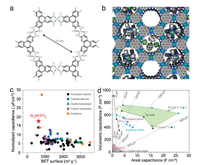 Figure 1 (a) Molecular structure of Ni3(HITP)2 MOF. (b) Relative size of pores, Et4N+ cation and BF4- anion, and acetonitrile molecule. (c) Comparison of areal capacitances of Ni3(HITP) with various porous carbon materials. (d) Comparison of the volumetric and areal capacitance of Ni-HAB electrodes (green area) with other materials. (a–c) Reproduced with permission [7]. Copyright 2017, Springer. (d) Reproduced with permission [1]. Copyright 2018, Springer.