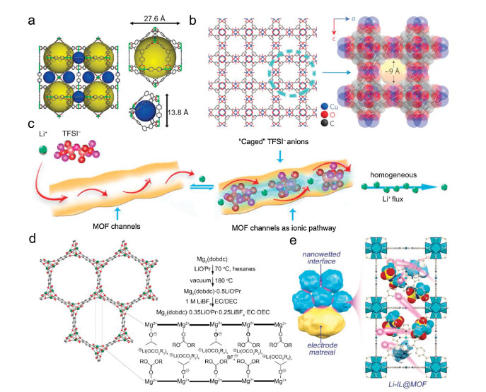 Figure 2 Crystal structure of (a) Ni-MOF and (b) HKUST-1. (c) The selective lithium ionic transport in the pores of HKUST-1. (d) Crystal structure and preparation route of Mg2(dobdc) MOF. (e) Schematic illustration for the nanowetted electrode/Li-IL@MOF electrolyte interface and crystal structure of Li-IL@MOF electrolyte. (a) Reproduced with permission [8]. Copyright 2017, American Chemical Society. (b) Reproduced with permission [10]. Copyright 2016, Springer. (c) Reproduced with permission [2]. Copyright 2018, Elsevier. (d) Reproduced with permission [11]. Copyright 2011, American Chemical Society. (e) Reproduced with permission [13]. Copyright 2018, Wiley.