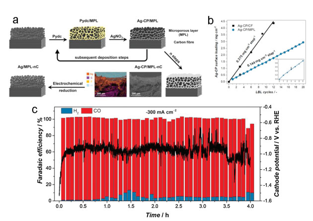 Figure 3. Scheme of the preparation of Ag/MPL catalysts, the sequential deposition of Ag-CP via the alternating adsorption of the dicarboxylic linker and the metal node, and the cross-sectional elemental maps of C, F, Ag and F (a). Fluorine can be found on the PTFE-treated carbon fabric, while Al signal comes from the sample holder. Increasing surface loading in subsequent deposition steps on bare carbon fiber and MPL/carbon cloth (b). CO2ER performance of the Ag/MPL-3C electrode in a gas-fed zero gap flow electrolyzer at -300 mA/cm2 (c). (a–c) Reproduced with permission [19]. Copyright 2017, Royal Society of Chemistry.2.3 Advances in science and technology to meet challenges