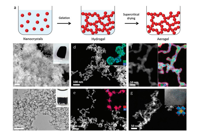 Aerogels are synthetic solid materials with ultralow density, high continuous porosity and extremely large surface area, making them of immense importance in various applications such as catalysis, energy storage, piezoelectrics, thermoresistors, and sensors [30]. The research on aerogels has been originated from the pioneering work on the synthesis of silica aerogels based on tetramethoxysilane in the early 1930s [31]. Since then, research on functionalities and applications of aerogels has been extensively explored by widening the molecule-based precursors from inorganic (e.g., metal oxide, carbide) to organic (e.g., polymer, cellulose) and carbon (e.g., carbon nanotubes, graphene) materials [32]. For these conventional aerogels, their hydrogels are generally obtained from gelation of the solution of certain molecule precursors. It should be noted that this gelation process is usually based on condensation/polymerization reactions of the molecule precursors, thus restricting the possible precursor materials and limiting the modification of surface properties. Correspondingly, special interests shifted to the use of colloidal nanocrystals (NCs) as the precursors, which implies tremendous opportunities to design and synthesize aerogels with desired physical and chemical properties.