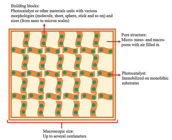 Photocatalysis has been considered as one of the most promising techniques that meet the requirement to solve energy and environment problems owing to its facial process and infinite green energy source [77]. Under light illumination, solar energy can be converted to chemical energy to realize environmental remediation and clean energy production over photocatalyst. However, most reported photocatalysts are in powder form, which has a strong tendency to agglomerate thus affecting the light absorption and pollutant adsorption. Moreover, powdery photocatalysts are difficult to recover, resulting in secondary pollutant. To overcome these weaknesses, aerogel photocatalyst with excellent monolithic properties exhibits great potential [78]. Aerogel is a monolithic pore material with extremely low densities, large specific surface areas and high porosity, which have nanoscale features with a total monolith size of several centimeters. Since aerogel photocatalyst is constructed by photocatalyst building blocks, it can be regarded as a bridge connecting the nano and macro worlds, in which the building blocks retain their photocatalytic properties while the 3D interaction of the photocatalyst building blocks creates new function. The porous structure of aerogel provides fast transport pathways to promote the absorption of pollutant while the photocatalyst building blocks absorb light and generate charge carriers to achieve solar energy conversion and environmental remediation. Fig. 6 reveals the structure and feature of aerogel photocatlayst.
