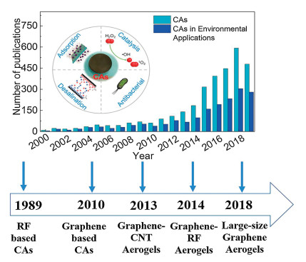 Many studies contribute to increase the basic knowledge on the structure and properties dependent CAs performance [92]. Adsorption is the mostly explored performance, which is not only an efficient and facile approach to remove contaminants from water or air, but also the theoretical basis of multifunctional performance in environmental analysis, catalytic oxidation and electrosorption. Diverse contaminants, including heavy metal or radioactive metal ions, dyes, oils, antibiotics, and other concerning pollutants, can be removed from environment by adsorption, and the selectivity and capacity are mainly controlled by porous structures, surface functional groups and physicochemical properties of CAs. Adsorption of dissociated ionic pollutants can be improved by tuning surface charges to strengthen electrostatic interaction. CAs are generally negatively charged at neutral pHs and have better adsorption capacity for positively charged substance, like heavy metal ions and cation dyes. However, removal of anionic pollutants can be promoted by incorporating positively charged groups (e.g., amines) or polymers (e.g., polyethyleneimine or polydopamine). Simultaneously, the adsorption of pollutants containing aromatic rings can be influenced by π-π interaction, and hydrogen bonding interaction is involved in the removal of adsorbates containing carboxyl and hydroxyl groups. Moreover, the acidity and alkalinity of surface sites can influence the adsorption of chemicals. CAs have great potential to be used for uptake and selective catalytic reduction of CO2, a typical acidic chemical [93]. Creating basic sites from pyrolyzing a Schiff-base porous polymer aerogel or incorporating heteroatoms like nitrogen can significantly enhance CO2 capture capacity [94]. All such interactions in adsorption is relevant to the properties of surface sites.