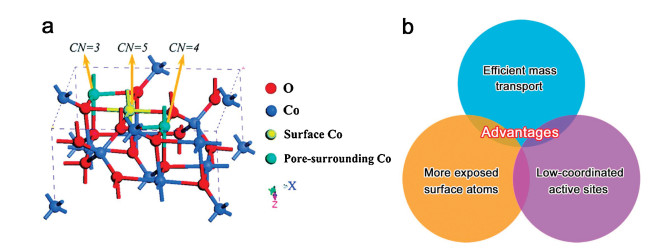 Figure 9 (a) Crystal structure of Co3O4 near a pore (CN, coordination number). Reproduced with permission [99]. Copyright 2014, Royal Society of Chemistry. (b) Advantages of porous metal oxide nanomaterials for electrocatalysis.