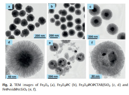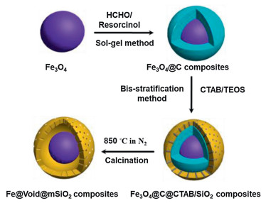 Fig. 1 shows illustration of the formation of yolk-shell structured Fe@void@mSiO2 composites by a facile and straightforward high temperature in-situ reduction process. First, uniform Fe3O4 nanoparticles were prepared via a modified solvothermal process and then encapsulated with a resorcinol formaldehyde (RF) polymer layer through a sol-gel method, giving rise to coreshell structured Fe3O4@RF composites. Then, a biphase stratification method was adopted to coat CTAB/SiO2 composite layer onto the surface of Fe3O4@C composites, which leads to Fe3O4@C@C-TAB/SiO2 composites. Finally, uniform yolk-shell structured Fe@void@mSiO2 composites were obtained after calcination in N2 at 850 ℃.