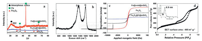 The wide-angle X-ray diffraction (XRD) pattern of Fe@void@m-SiO2 composites (Fig. 3a) displayed several sharp which can be assigned to iron nanoparticles while they were not observed in Fe3O4. The wide peaks at 2θ = 22° and 26° can be assigned to amorphous mesoporous silica and the graphitized carbon, respectively. Two broad peaks located at 1350 and 1590 cm -1 in the Raman spectra are attributed to the D- and G- bands, respectively (Fig. 3b). The hysteresis loop data suggests that our material possess a quite high magnetization of 105 emu/g, which is much stronger than Fe3O4 (56 emu/g, Fig. 3c). Nitrogen adsorption-desorption isothermals show a typical type-IV curve with distinct hysteresis loops within the relative pressure band of 0.45-0.80, indicating the uniform mesoporous structure (Fig. 3d). The BET surface area of the Fe@void@mSiO2 composites are calculated to be 495 m2/g. The pore size distribution derived from the adsorption branch using the BJH method shows that the corresponding pore size is centered at 6.9 nm, making them an ideal candidate for the later applications.