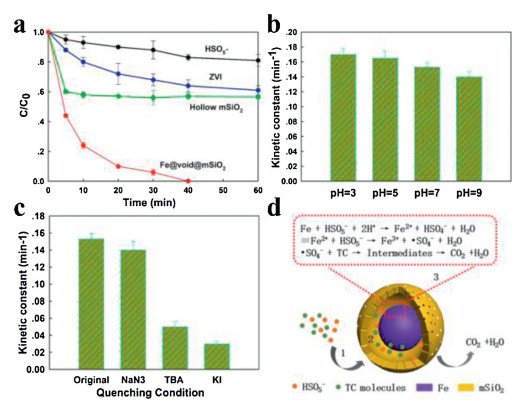 (1) where C is the concentration of TC at time t, C0 is the initial TC concentration and k is the pseudo-first-order reaction rate constant. We caught sight of the kinetic constant at pH of 7 and 9 are calculated to be 0.15 and 0.14 min -1, respectively, slightly smaller than that at pH of 3, suggesting that such catalysts are able to work over a broad pH range. As illustrated in Fig. 4c, the production of ·OH/SO4·- as the dominate species in this systemwas proved through the scavenging test. The addition of NaN3 (singlet oxygen (1O2) scavenger) slightly reduced the reaction rate, indicating that 1O2 is not the main species while the addition of tert-butanol significantly reduced the degradation rate, suggesting that ·OH/SO4·- are the main contributor. Note that by the addition of KI, which is a scavenger for the surface bonded radicals, the reaction rate sharply reduced, suggesting that surface radicals play the most important role in the degradation process. Magnetic mesoporous silica exhibits extraordinary performance, which can be ascribed to the synergistic effect from its unique textual structures. Firstly, the ordered large mesopores facilitates the mass transfer of both PMS and TC molecules between solid and phases aqueous. Secondly, the presence of mesoporous silica shell greatly enhances the adsorption of pollutants molecules and enrichs them in the void space of the nanoreactor, which could be beneficial for surface reaction [44]. The adsorption test obviously shows that the hollow structured mesoporous silica shell possesses a high removal efficiency for TC (~40%). Finally, the surface iron species reacts with the adsorbed PMS to produce large quantity of radicals such as ·OH/SO4·-, which can directly in-situ oxidize the TC molecules confined in the void space into small molecules or even CO2 and H2O (Fig. 4d).