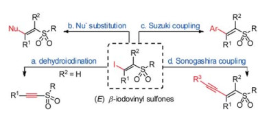 Vinyl sulfones are a type of important organic compounds and have been widely applied in organic synthesis and drug discovery [1, 2]. (E)-β-Iodovinyl sulfones are one of structurally special types of vinyl sulfones (Scheme 1). Their iodine atoms are responsible for many unique transformations, such as: (a) dehydroiodination [3], (b) nucleophilic substitution [4], (c) Suzuki coupling [5], (d) Sonogashira coupling [6]. They have been widely used as versatile synthons for the synthesis of functionalized sulfones.