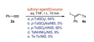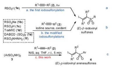 Herein, we report a novel method for the synthesis of (E)-β-iodovinyl arenesulfones (4), in which N, N'-disulfonylhydrazines [(ArSO2NH)2, 3] were introduced as new sulfonylating reagents. As shown in Scheme 2c, the desired product 4 was synthesized efficiently by mixing an alkyne (2), a N, N'-disulfonylhydrazine (3) and NIS (N-iodosuccinimide) together in aqueous THF at room temperature within five minutes.