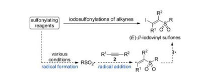 The mechanism studies [3e, 5a–c, 6b, 7 - 11] indicated that the iodosulfonylations of alkynes similarly went through a radical addition pathway. As shown in Scheme 3, this radical addition was initiated by a sulfonyl radical (RSO2·) [3e] that was generated in situ from a sulfonylating reagent. Therefore, the methodology study for the synthesis of (E)-β-iodovinyl sulfones actually has been became an issue how to conveniently and efficiently generate the sulfonyl radicals.