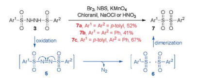 Thus, we made a comprehensive investigation for different types of sulfonyl substituted hydrazines. We were surprised to find that, as early as 1970 [12], N, N'-disulfonylhydrazines [Ar1SO2NHNHSO2Ar2 (3)] have been proven to be the most convenient and efficient precursors of the sulfonyl radicals. As shown in Scheme 4, when compound 3 was treated with an oxidant (such as Br2 [12], NBS [12], KMnO4 [12], Chloranil [12], NaOCl [13] or HNO3 [14]), it quickly released N2 via an azo-intermediate (5) to generate two sulfonyl radicals (6). Finally, two sulfonyl radicals were dimerized into a disulfone R1SO2-SO2R2 (7, Ar1 = Ar2 or Ar1≠Ar2). For example, the disulfone Ts-Ts (7a) was produced in 52% yield by treatment of TsNHNHTs (3a) [14b] with HNO3 at room temperature for 1 h. The disulfone PhSO2-SO2Ph (7b) was obtained in 41% yield when (PhSO2NH)2 (3b) was treated with NaOCl at 0 ℃ for 5 min [13]. Remarkably, unsymmetrical disulfone Ts-SO2Ph (7c) was obtained as single product in 67% yield from the oxidation of unsymmetrical TsNHNHSO2Ph (3 h) [14b]. Clearly, these disulfons 7 wereformedby a self-dimerization controlled strongly by the "solvent-cageeffects" [12].