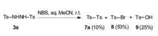 Our investigation also showed that N, N'-disulfonylhydrazines (3) have had several important synthetic applications in recent years [15]. In these works, only the reactions of N-atom in the compounds 3 were emphasized. In fact, N, N'-disulfonyl-hydrazines (3) have not been used as the precursors of sulfonyl radicals in organic synthesis except the simple self-dimerization synthesis of disulfones (7) in nearly half a century. This phenomenon may be caused by the negative influence of the "solvent-cage-effects" on sulfonyl radicals. However, we carefully found that a mixture including the product Ts-Br (8) was obtained when 3a was treated with NBS in aqueous MeCN (Scheme 5) [12]. We strongly believed that the formation of 8 resulted from the fact that a radical Ts·was captured by a radical Br·. This result also indicated that the "solvent-cage-effects" on sulfonyl radicals may be broken by an external radical scavenger.