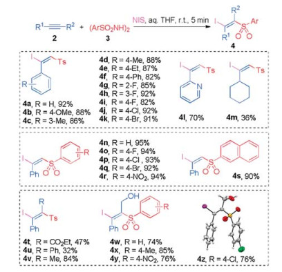 In conclusion, a new method for highly efficient synthesis of (E)-β-iodovinyl arenesulfones was developed by simply mixing an alkyne, a N, N'-disulfonylhydrazine and NIS together in aqueous THF for 5 min at room temperature. Its success is mainly due to two distinctive works: (a) N, N'-disulfonyl-hydrazines were introduced as highly efficient sulfonylating reagents; (b) the combinations of N, N'-disulfonylhydrazines/NIS were discovered as highly efficient iodosulfonylating reagent of alkynes.