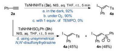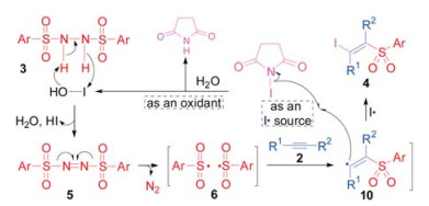 Thus, a possible pathway for our method was proposed as shown in Scheme 9. Initially, NIS was hydrolyzed by H2O to form the stronger oxidant HOI, by which N, N'-disulfonyl-hydrazine (3) was oxidized into the corresponding azo-intermediate (5). The azo-intermediate (5) was then spontaneously decomposed into two sulfonyl radicals (6). When the sulfonyl radical (6) was captured by an alkyne (2), a vinyl radical (10) was formed. Finally, the vinyl radical (10) attacked NIS to get an iodine radical to yield the target product (4). In this pathway, NIS served as the precursors for both oxidant HOI and iodine radical (I·). Since no additional peroxide oxidant needed, our method was performed under extremely convenient and safe conditions.