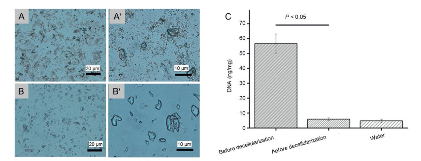 Figure 1. Microscope observations of microfilaments before (A, A') and after (B, B') decellularization. (C) Quantification of DNA content for microfilaments before and after decellularization. Scale bars: 20/10 μm for (A, B)/ (A', B'), respectively.The cartilage acellular matrix scaffolds are generally white and porous mesh, with a diameter of 5 mm and a thickness of 2 mm. The cartilage decellularized scaffolds were observed under stereoscopic microscope and showed a porous network throughout the scaffolds, with uniform distribution of matrix and interconnecting pores (Fig. 2A). To further visualize the surface morphology and confirm the porous structure of the scaffolds, SEM was applied. As shown in Figs. 2B and C, the scaffold was porous with numerous 50-200 μm interconnected pores, and the pores were separated by flat thin plates. To determine the porosity of the scaffolds, the ethanol intrusion method using pycnometer was employed. By carefully weighting the mass of pysnometer and containing ethanol with and without scaffold in constant environment, the porosity of the scaffold was calculated to be as high as 89.5% ± 3.41%. The highly porosity can greatly facilitate the cell in growth and enhance the drug loading capacity of the scaffolds.